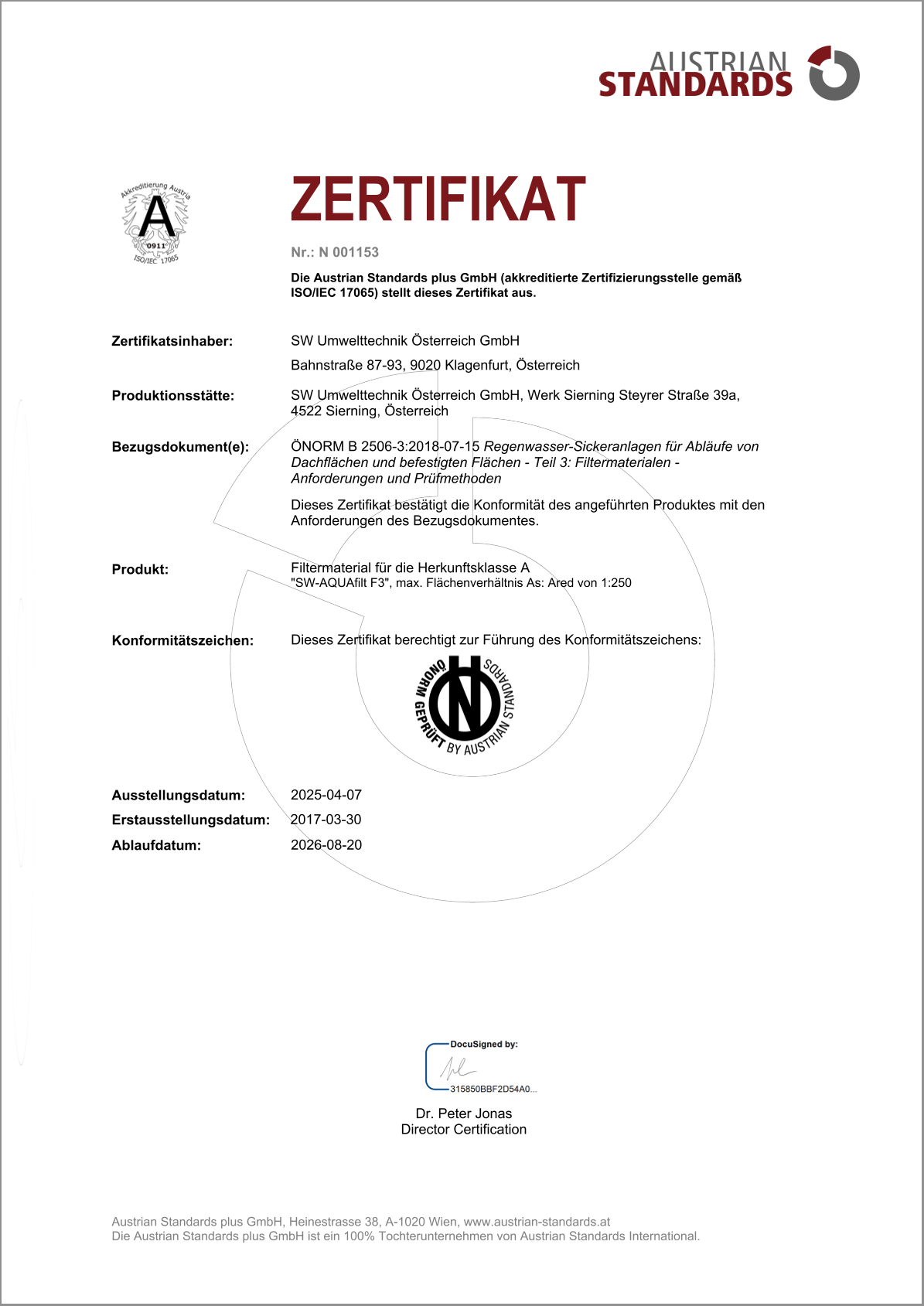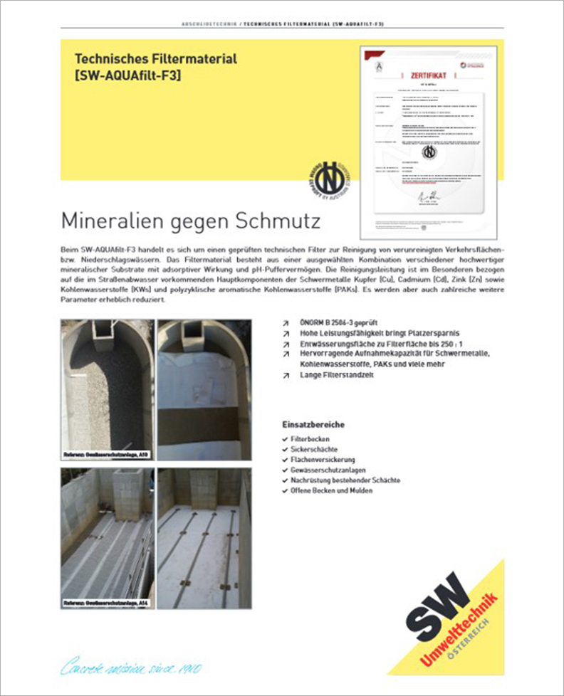 AUSTRIAN STANDARDS Zertifikat ÖNORM für SW-AQUAfilt-F3 Filtermaterial