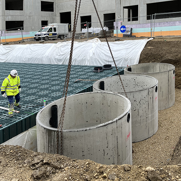 Das Oberflächenwasser der befestigten Freiflächen wie Zufahrtsstraßen und Abstellflächen beim neu errichteten Gewerbe- und Logistikpark „City Park Vienna“ in Liesing, werden über Einlaufschächte abgeleitet und in vier Verkehrsflächensicherungsschächten gereinigt. Das vorgereinigte Wasser gelangt über Verteilerschächte in nachgeschaltete Filterbecken mit technischem Filtermaterial und versickert danach in Sickerboxen.
