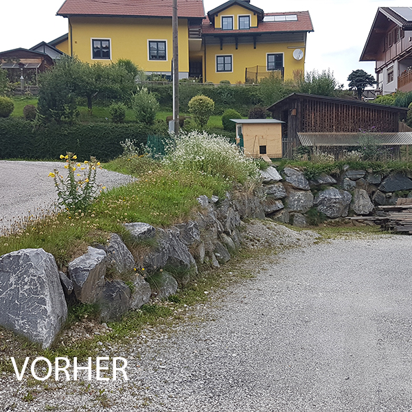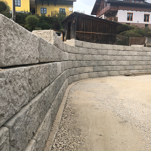 Die abrutschgefährdete alte Steinschlichtung entlang der Hofeinfahrt eines Privathauses wurde durch das SW-Stützwandsystem ersetzt. Die Stützwand ist in Stufen aufgebaut und passt sich dem Gelände und der dahinter liegenden Straße optimal an.