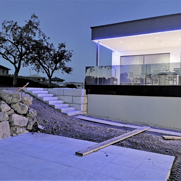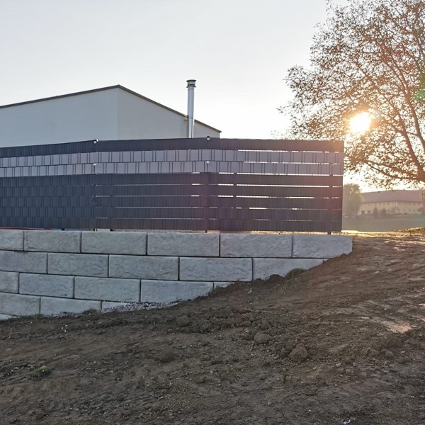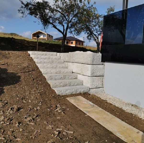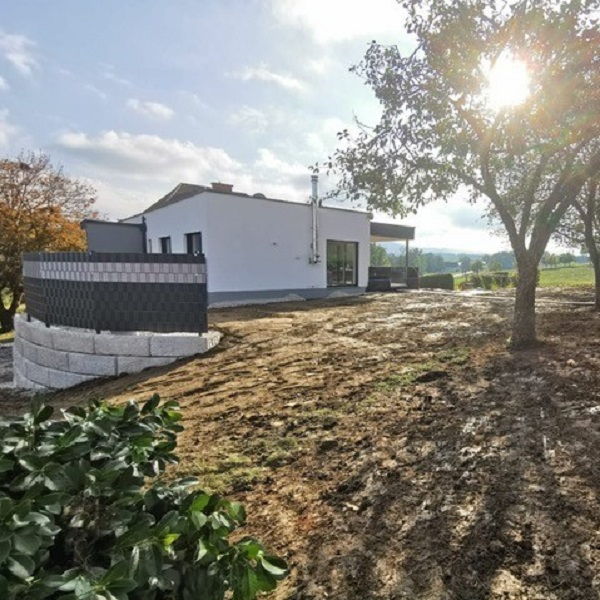 Im Zuge der Errichtung dieses Einfamilienhauses wurde nach einer optimalen Lösung zur Hangsicherung gesucht. Insgesamt wurden zwei Mauern mit dem SW-Stützwandsystem versetzt, die die Optik des modernen Hauses ideal ergänzen.