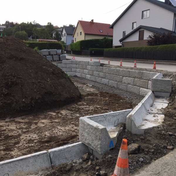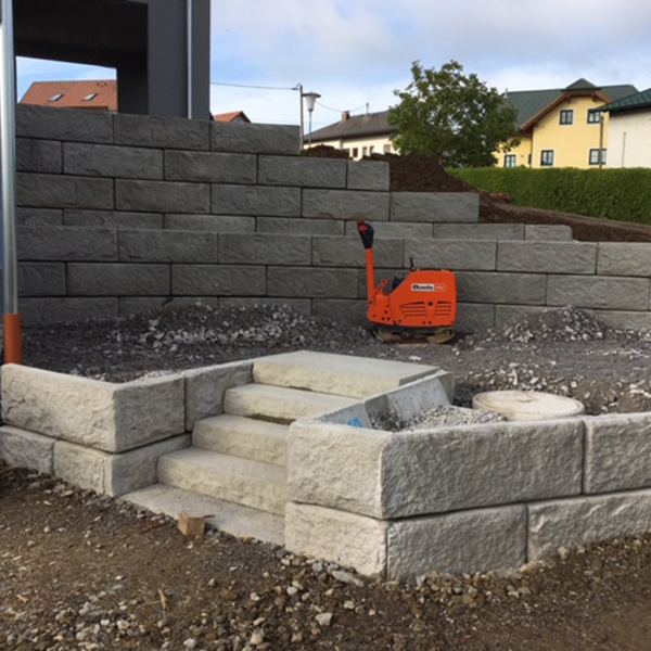 Durch das SW-Stützwandsystem wurde eine Terrassierung und Abgrenzung zur Gemeindestraße errichtet, wobei alle Ebenen frei zugänglich sind.