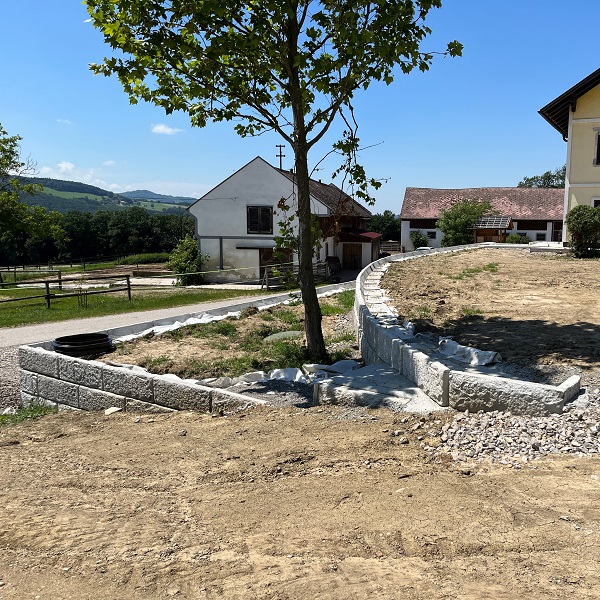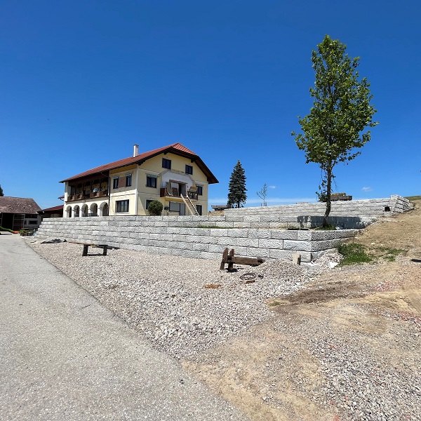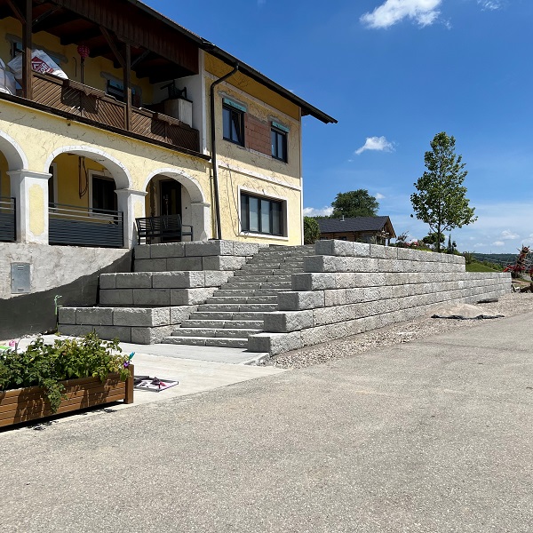 In Kasten wurden bei einem Einfamilienhaus mehrere Stützwände errichtet. Hier kamen mehrere Ausführungen zu tragen - eine Seite der Stützwand wurde mit einem Stufenaufgang erbaut, die Andere in Terrassenform und geschwungener Zwischenebene. Die obere Stützmauer hat einen abgestuften Abschluss mit Vollsteinen.