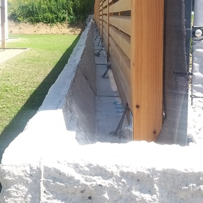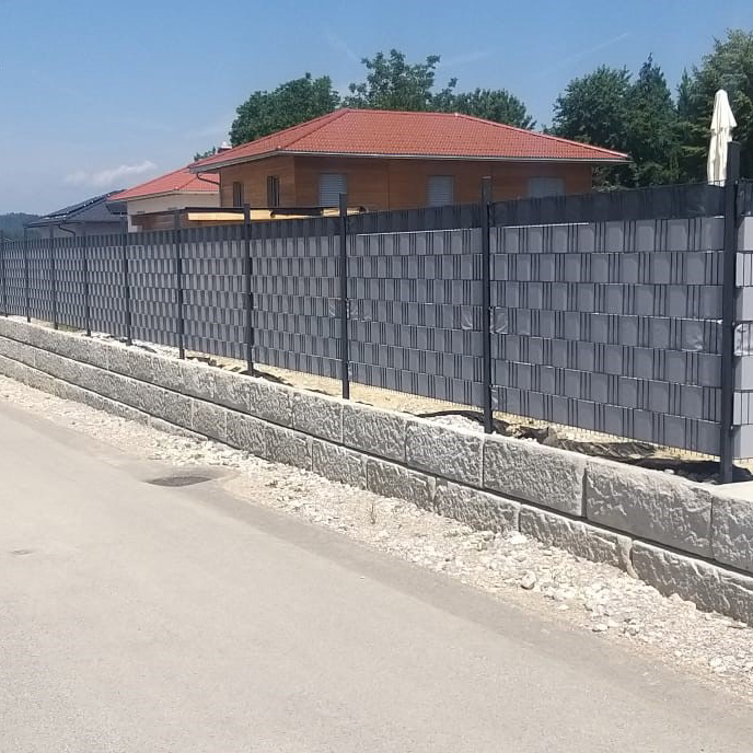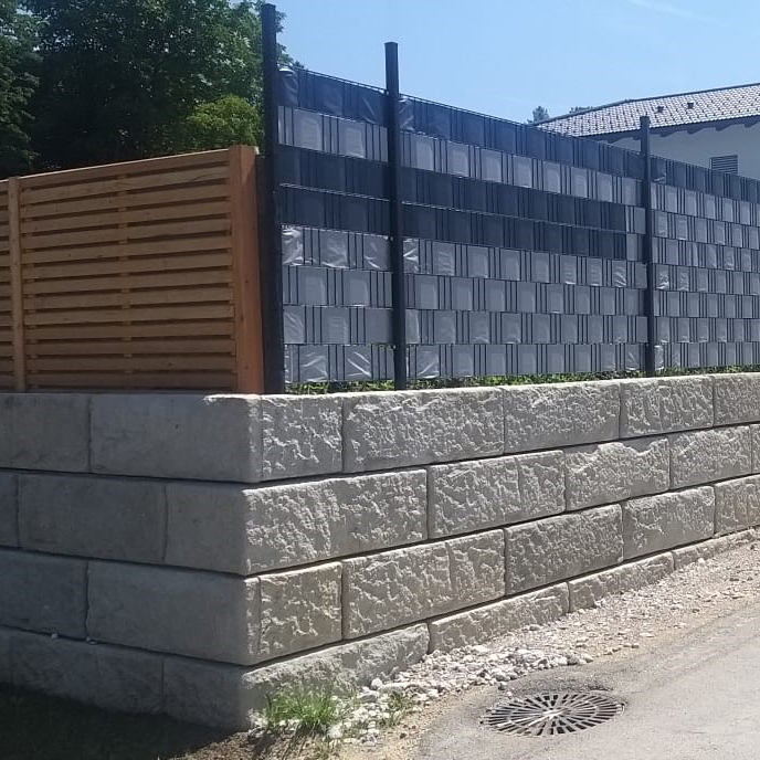Durch das SW-Stützwandsystem konnte hier eine Grundstückseinfassung in einem Gruß geschaffen werden. Weiters dient die Referenz als Anschauungsbeispiel für die verschiedenen Möglichkeiten des Sichtschutzes bei einem SW-Stützwandsystem. Die Mauer zum Nachbarsgrundstück wurde in einem späteren Bauschritt weitergebaut.