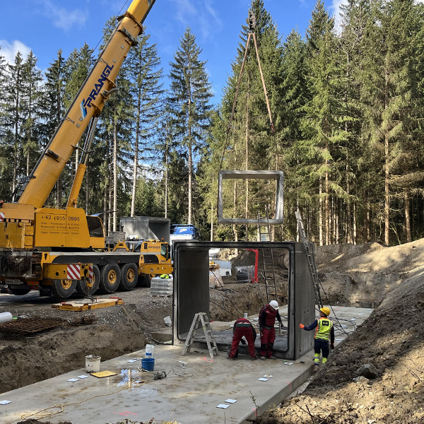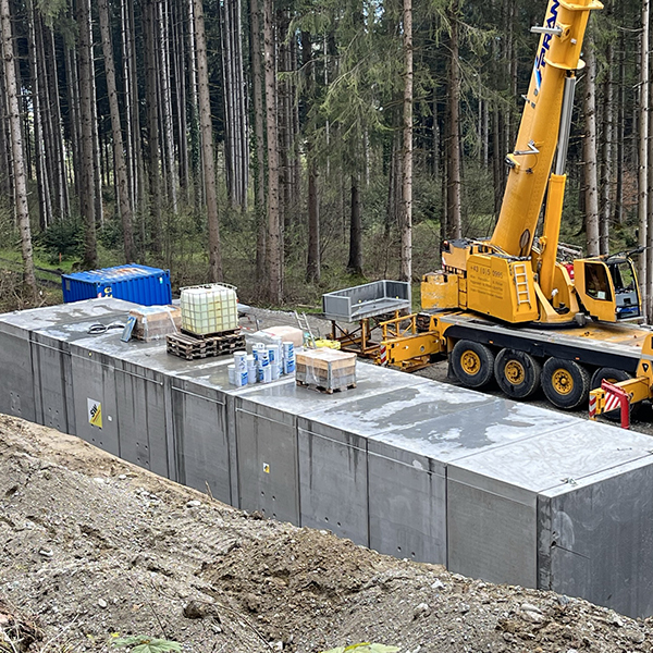 Im Zuge der Errichtung der Wasserversorgungsanlage in der Gemeinde Thaur, wurde auch der Neubau des Trinkwasserspeichers Gruabach realisiert. Hierbei handelt es sich um einen Trinkwasserspeicher bestehend aus je zwei Wasserkammern mit jeweils 80 m³ sowie einer Trocken- bzw. Schieberkammer inklusive Zugangsportal.